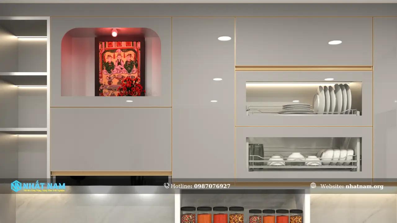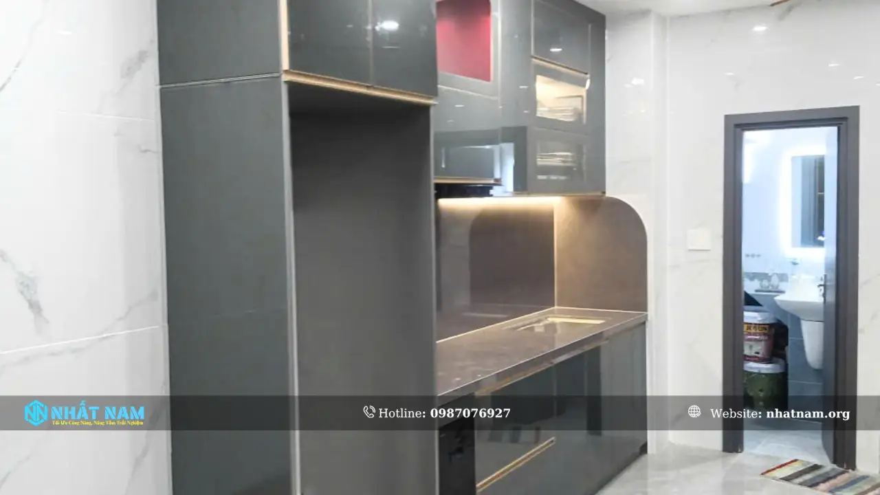 - Hệ tủ: Tủ trên, tủ dưới, tủ giáp trần, tủ ông táo …. các khoang chức năng bố trí theo không gian thực tế