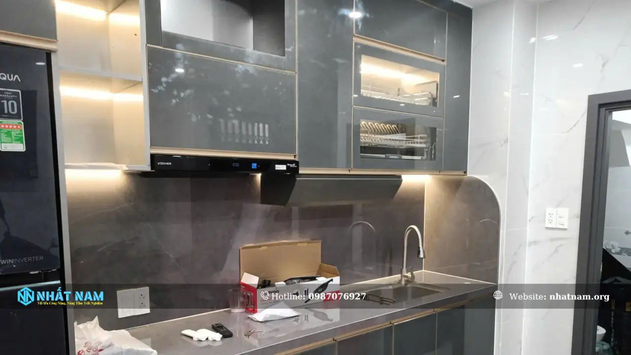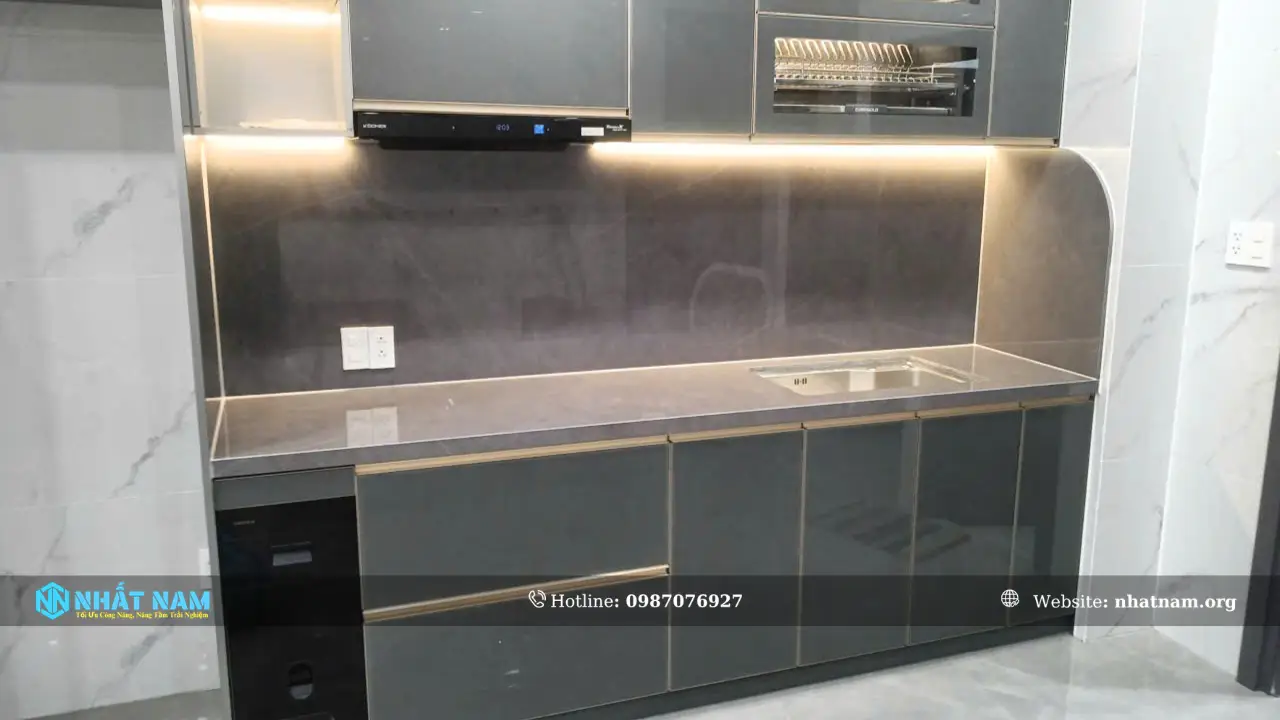 Công trình tủ bếp Inox cánh kính nhà anh Nam – Quận 3 được hoàn thiện với thùng tủ Inox 304 caro hai lớp chống bám vân tay, kết hợp cánh nhôm hợp kim phối kính màu cường lực 5mm. Đây là cấu hình vật liệu được lựa chọn nhằm đảm bảo độ bền, khả năng chống ẩm và giữ tính ổn định trong môi trường bếp.