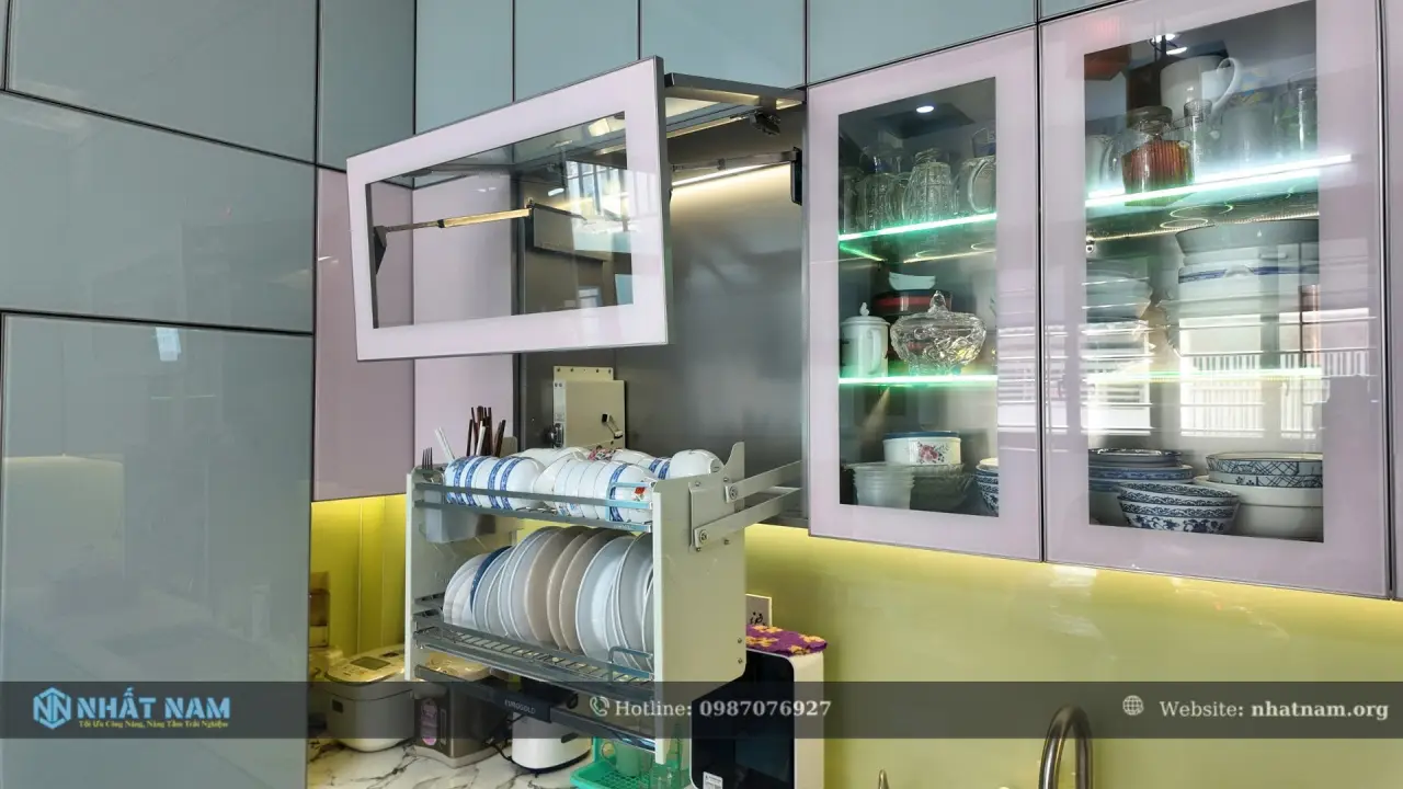 - Các phụ kiện tủ bếp: Giá bát đĩa nâng hạ, tay nâng Blum, Giá dao thớt, Giá liên hoàn, tủ kho 6 tầng nan dẹt cánh mờ, chậu rửa Inox, vòi rửa dây rút nóng lạnh, đèn Led…