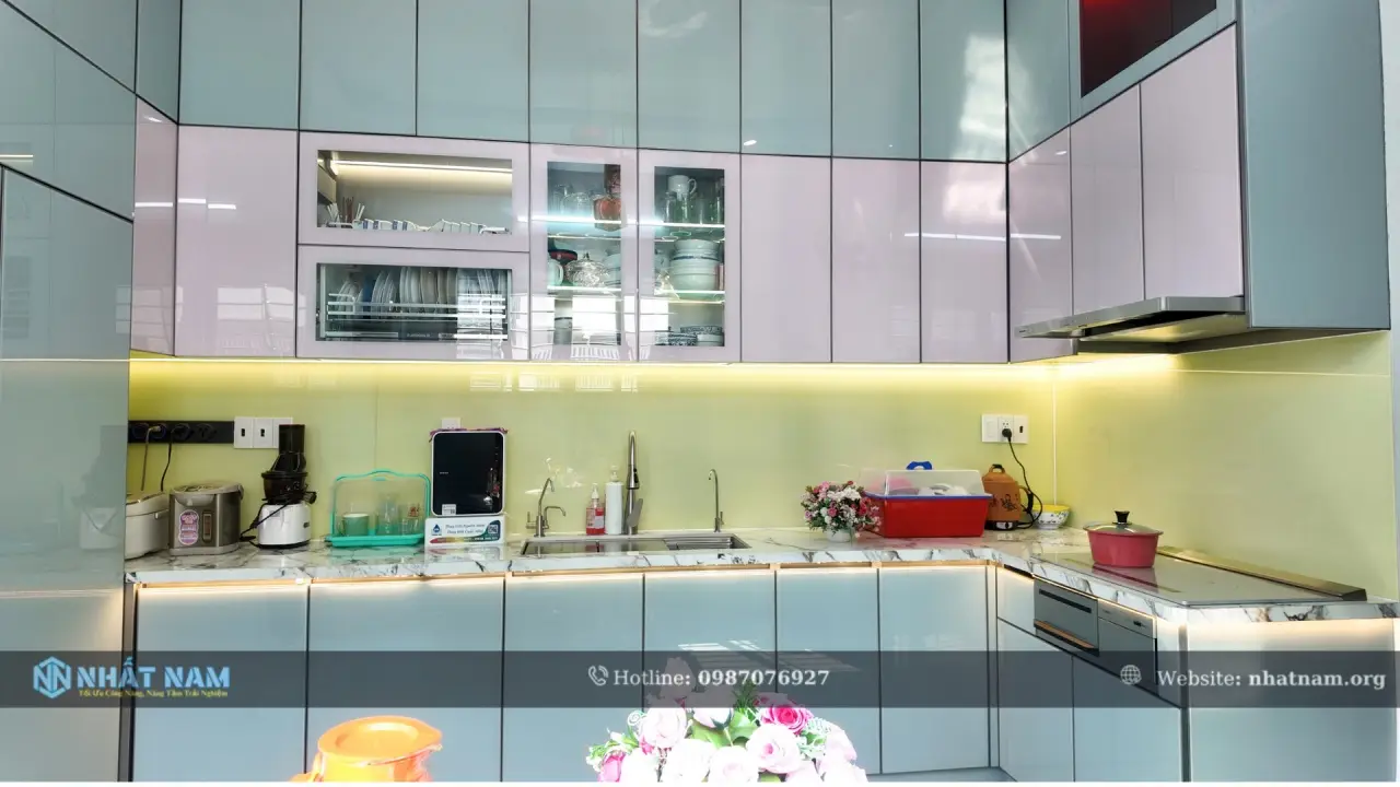 - Dự án: Công trình tủ bếp Inox cánh kính cường lực