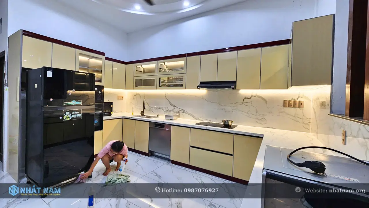 Khi nghiệm thu, khách hàng được hướng dẫn cụ thể về cách sử dụng, vệ sinh và bảo quản để duy trì độ bền và tính thẩm mỹ của tủ bếp trong thời gian dài.