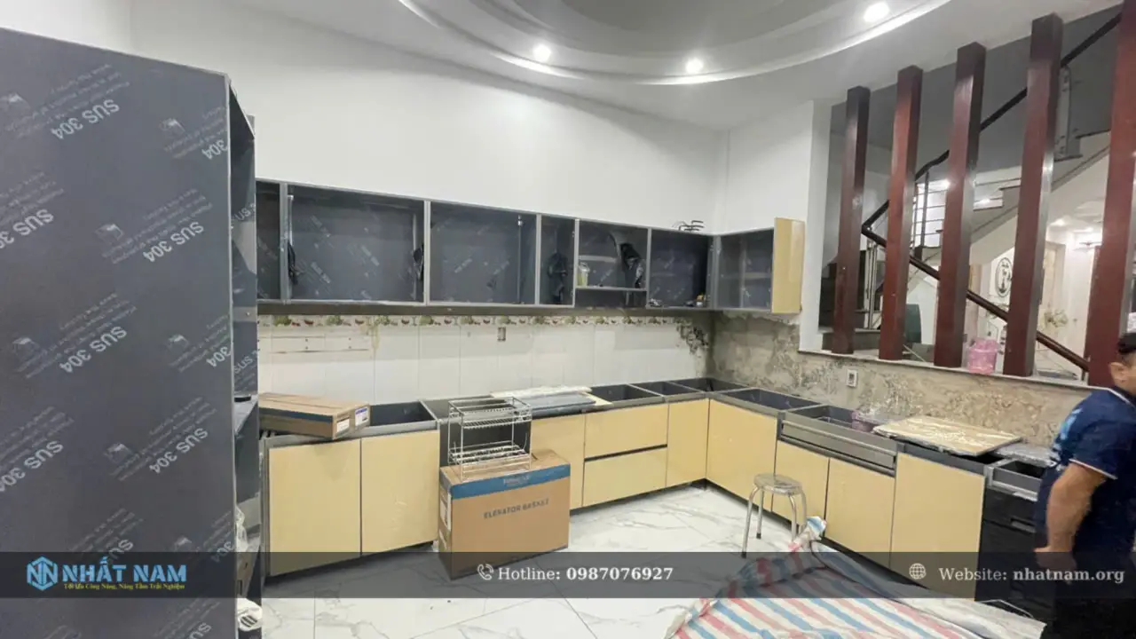 Công trình tủ bếp Inox cánh kính nhà chị Loan tại Gò Vấp, TP.HCM được hoàn thiện với khung tủ Inox 304 kết hợp cánh Inox dập caro và kính cường lực. Toàn bộ hệ tủ được Nhất Nam triển khai trọn gói từ khảo sát, thiết kế đến lắp đặt, đảm bảo sự đồng bộ và phù hợp với không gian thực tế.
