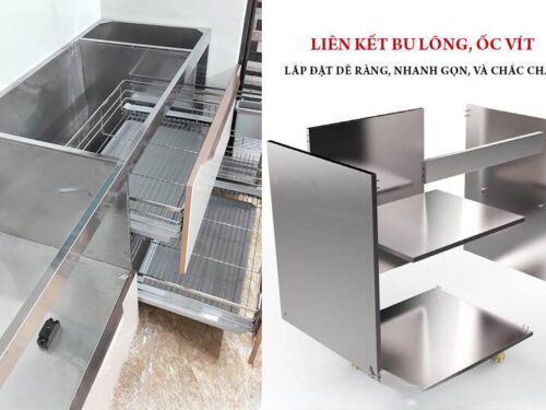 Phụ kiện tủ bếp: Để có một tủ bếp hiện đại và tiện nghi, không thể thiếu các phụ kiện bếp làm từ inox 304, chống han gỉ, chịu lực tốt và bền bỉ. Các phụ kiện này bao gồm giá đựng bát đĩa, xoong nồi, gia vị, giá góc liên hoàn, mâm xoay, và tay nâng tủ bếp.