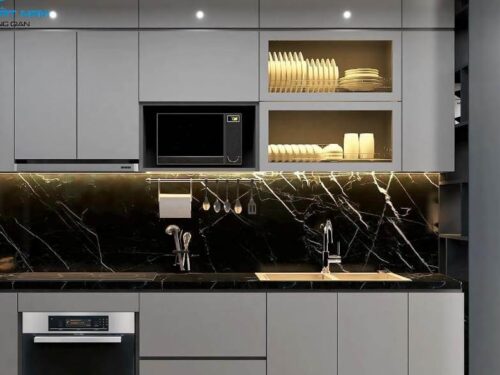 Thiết kế này giúp không gian bếp trở nên thoáng hơn và dễ dàng trưng bày các vật dụng như ly, chén, hoặc đồ trang trí. Kệ mở thường được kết hợp với ánh sáng LED để tăng thêm tính thẩm mỹ.