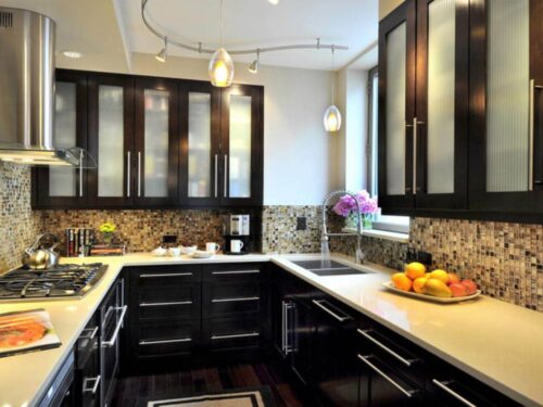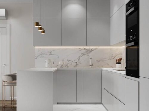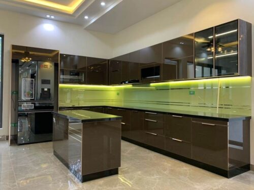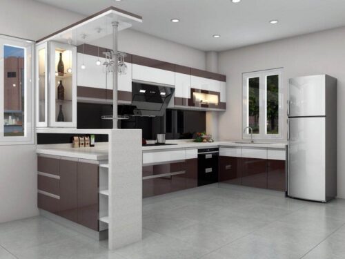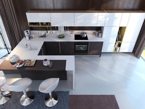 Với thiết kế phổ biến trong nội thất hiện đại, được đặt theo hình dáng của chữ “U”. Thiết kế này thường bao gồm ba mặt của tủ bếp hình chữ U được bố trí liên tiếp và tạo thành một không gian khép kín hoặc bán khép kín, phù hợp cho các không gian bếp từ trung bình đến lớn.
