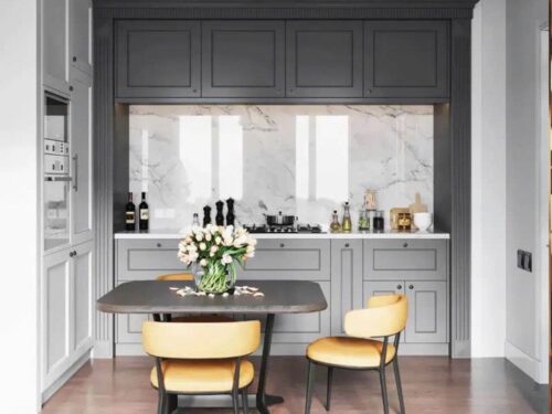 Tủ bếp tân cổ điển cánh huỳnh màu xám ghi hiện đại, kết hợp bàn ăn cùng tông tạo nên tổng thể ấn tượng, thanh lịch và rất thời thượng.