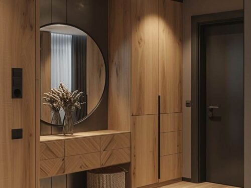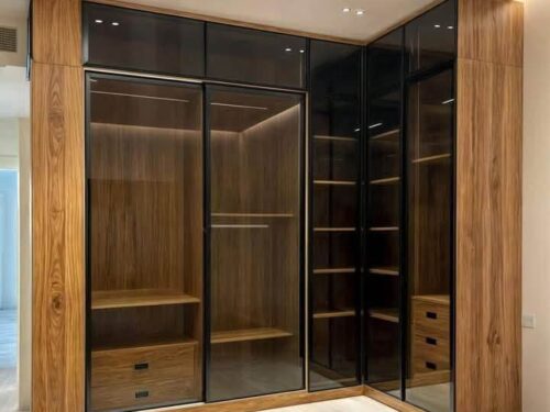 Cánh tủ có thể phủ Acrylic bóng gương, kết hợp kính hoặc gương soi để tăng tính tiện dụng.