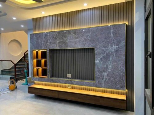 Sau khi hoàn tất việc lựa chọn chất liệu, đơn vị thi công sẽ tiến hành thiết kế vách tivi và gia công các thanh lam sóng theo kích thước yêu cầu. Các tấm lam sẽ được lắp ráp và hoàn thiện, tạo ra một vách tivi sang trọng, độc đáo.