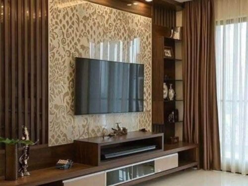 Mẫu vách tivi này sử dụng nhựa PVC được gia công theo hình dạng giống như vân gỗ, mang lại vẻ đẹp tự nhiên nhưng lại có độ bền cao, chống ẩm và chống mối mọt. Sự kết hợp giữa tính thẩm mỹ của gỗ và tính năng vượt trội của nhựa PVC giúp tạo ra một sản phẩm nội thất đẹp và bền bỉ.
