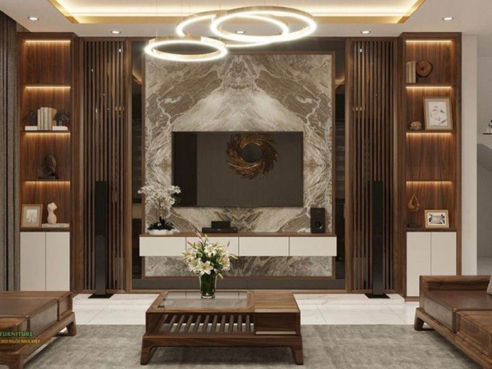 Những mẫu vách tivi vân đá hiện nay mang lại vẻ đẹp sang trọng và đẳng cấp cho không gian phòng khách, tạo điểm nhấn ấn tượng ngay từ cái nhìn đầu tiên. Sự phát triển mạnh mẽ của các công nghệ sản xuất vật liệu công nghiệp giúp cho vách tivi vân đá ngày càng đa dạng về mẫu mã và chất liệu, đáp ứng nhu cầu của mọi phong cách thiết kế nội thất.