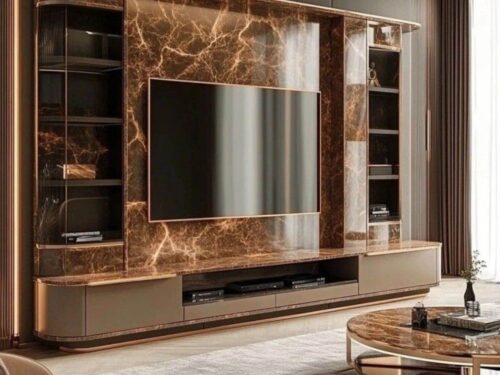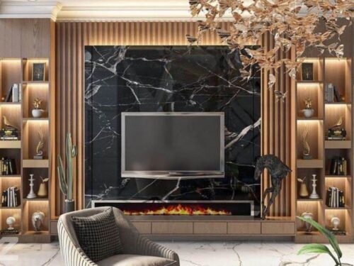 Đối với những không gian theo phong cách cổ điển hoặc luxury, vách tivi vân đá màu tối hoặc kết hợp với các vật liệu gỗ tự nhiên là lựa chọn lý tưởng. Mẫu vách này mang lại vẻ đẹp quý phái, tinh tế, tạo sự hài hòa và đẳng cấp cho phòng khách.