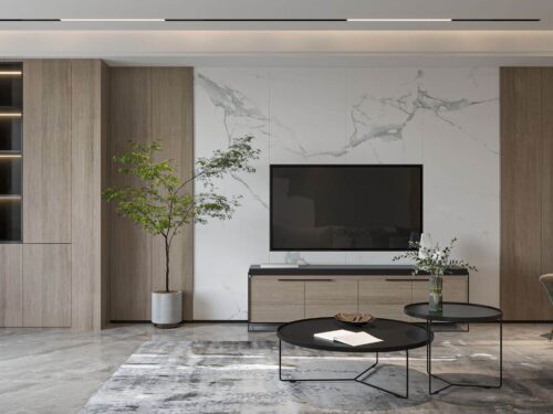 Phong cách tối giản yêu cầu những món đồ nội thất có thiết kế đơn giản và tinh tế. Vách tivi vân đá với các đường vân đơn giản, không quá cầu kỳ là lựa chọn hoàn hảo cho phong cách này, tạo nên không gian sống gọn gàng và thanh thoát.